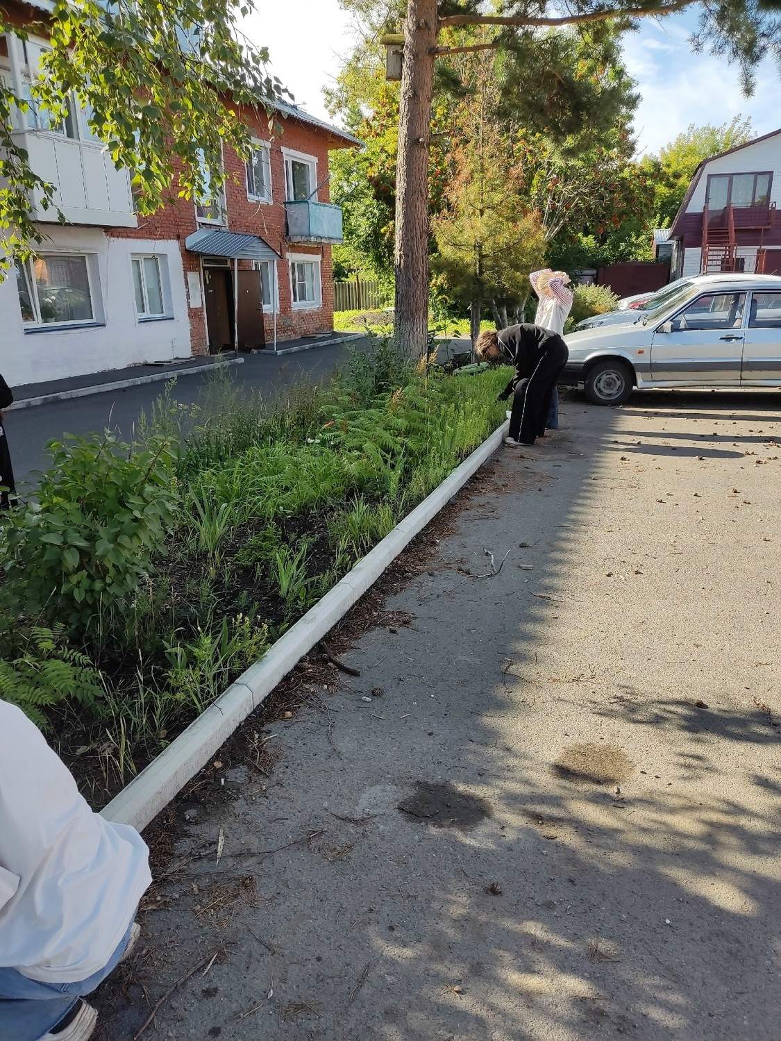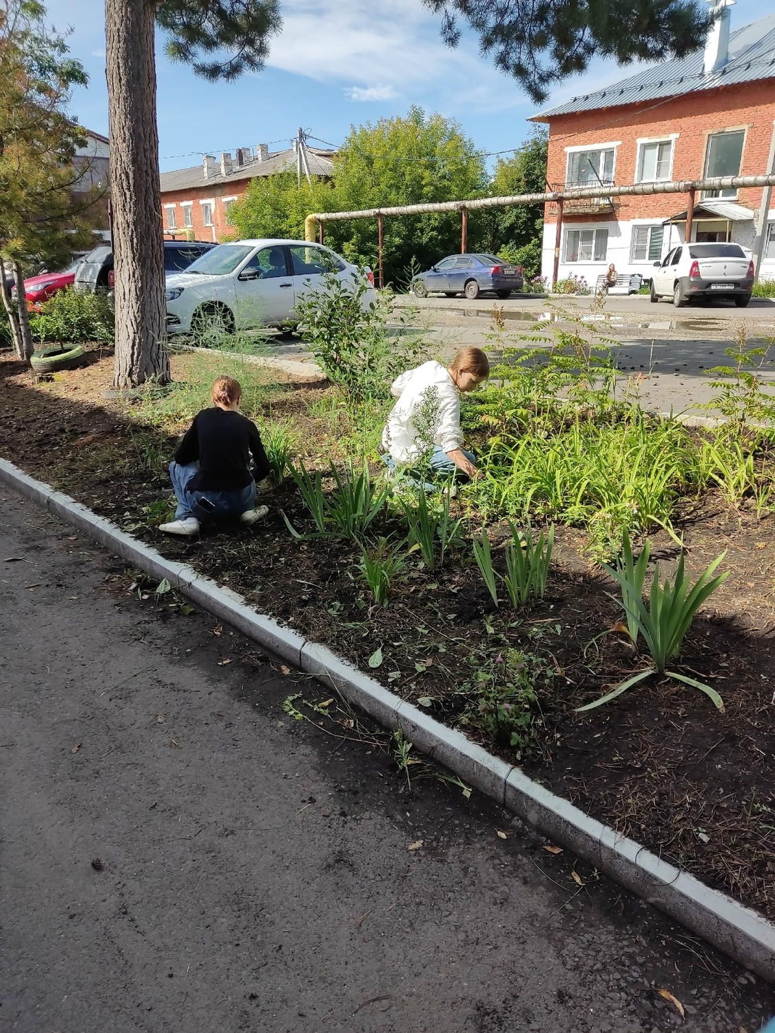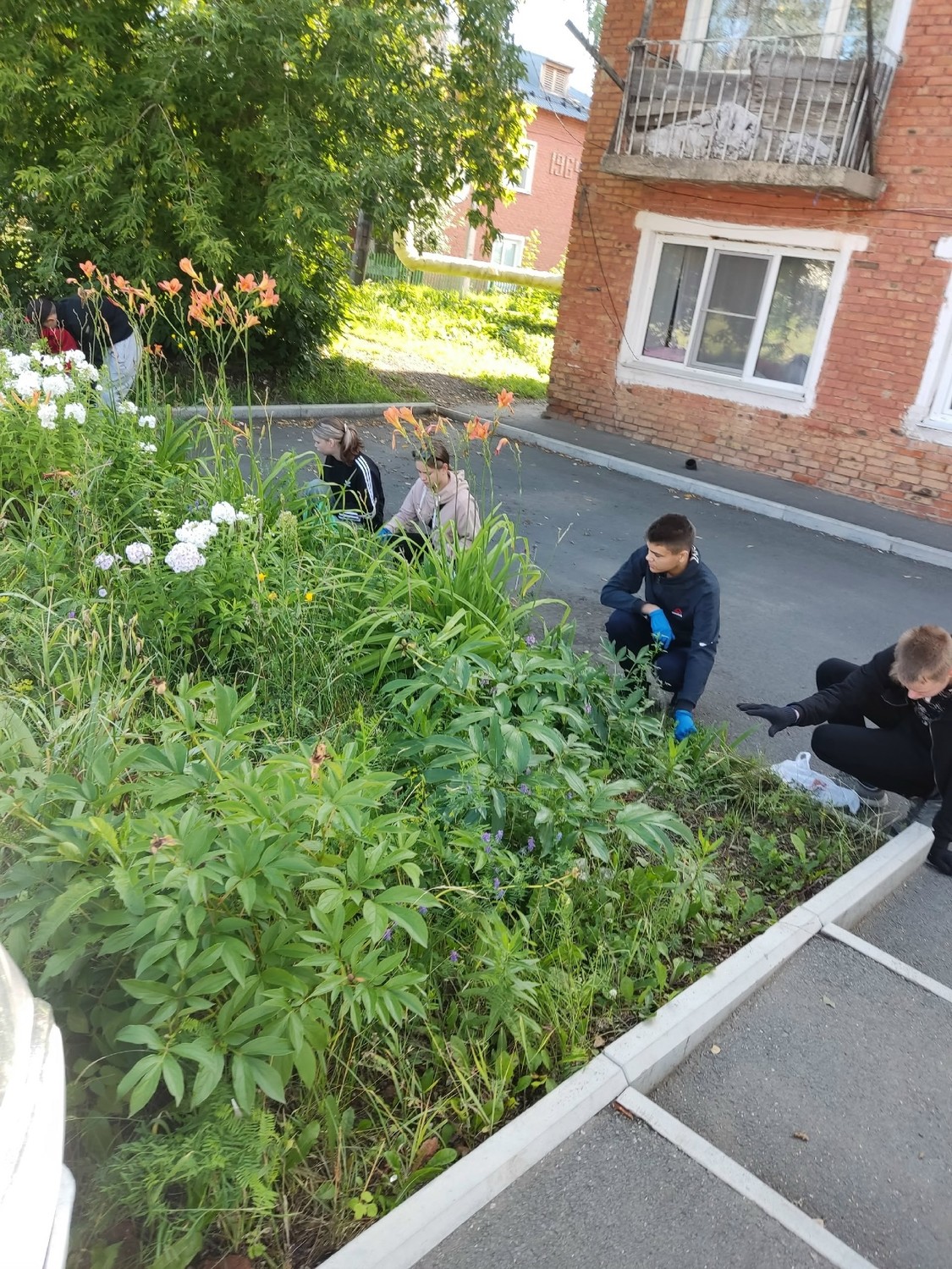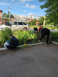 Ребята из трудового отряда активно участвуют в благоустройстве не только нашей школы но и района. Они привели в порядок клумбы возле многоэтажных домов, где проживает ветеран педагогического труда  нашей школы Галина Михайловна Князева.